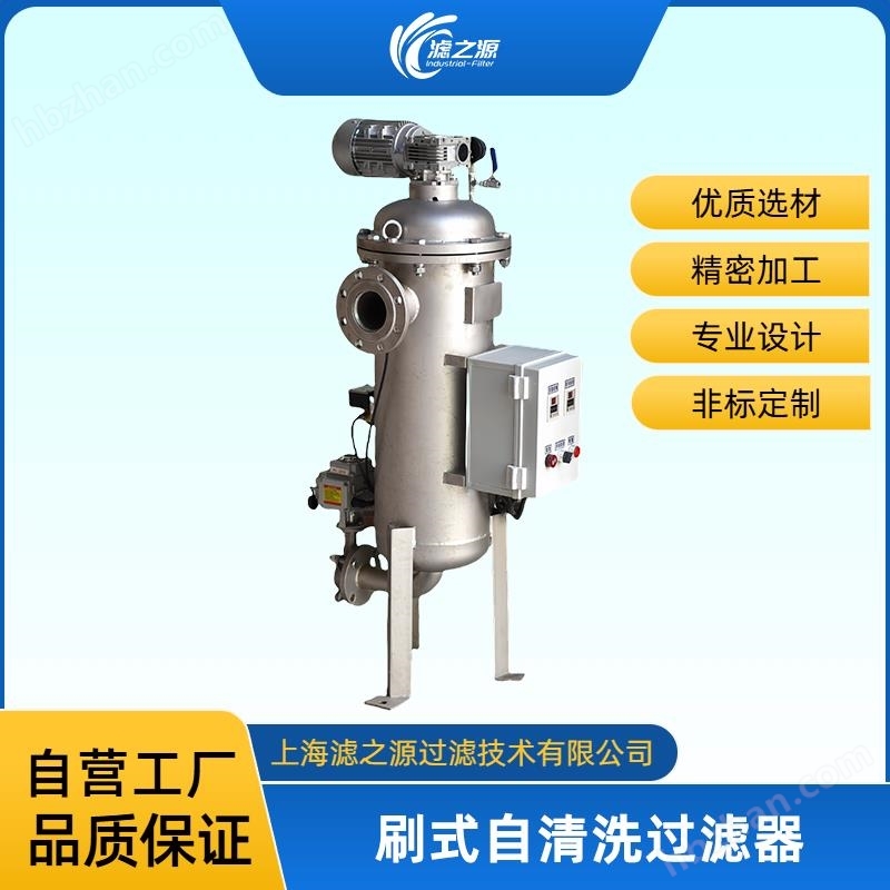 不锈钢刷式自清洗过滤器是一款高效智能的水处理过滤设备,其核心在于利用不锈钢刷对拦截在楔形丝网篮内侧或外侧的杂质进行自动在线清洗。该设备运行时,待处理介质流经高精度的楔形丝网篮,固体颗粒被有效截留;当滤网两侧压差达到预设值或设定时间时,控制系统会自动启动清洗程序:清洗电机驱动刷轴及刷毛紧贴网篮表面旋转,将粘附的污物刮除剥离,同时排污阀瞬时开启,利用系统水压或清洗水流将刮落的杂质迅速排出,整个过程无需中断水流或人工介入,实现了连续过滤与高效自洁,有效保障生产运行稳定,降低维护成本,是工业循环水、冷却水、原水预处理等领域保持过滤元件清洁畅通和系统高效运行的关键装备。