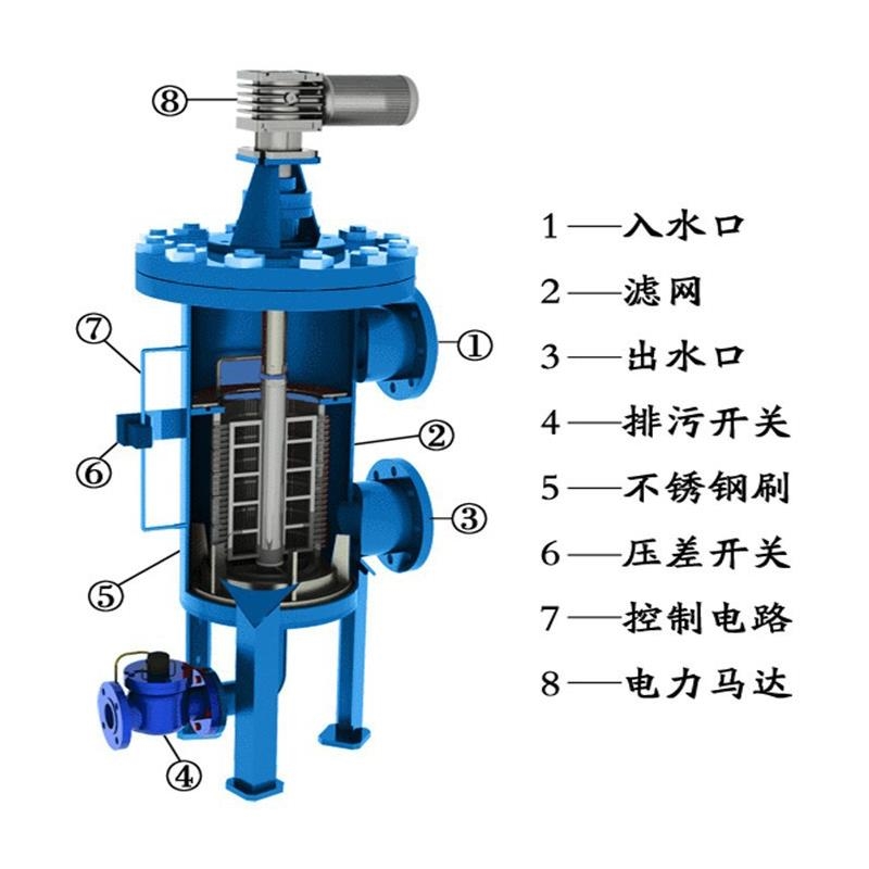 清洗系统: 由不锈钢刷毛和传动轴组成,负责旋转刮除滤网表面污垢。